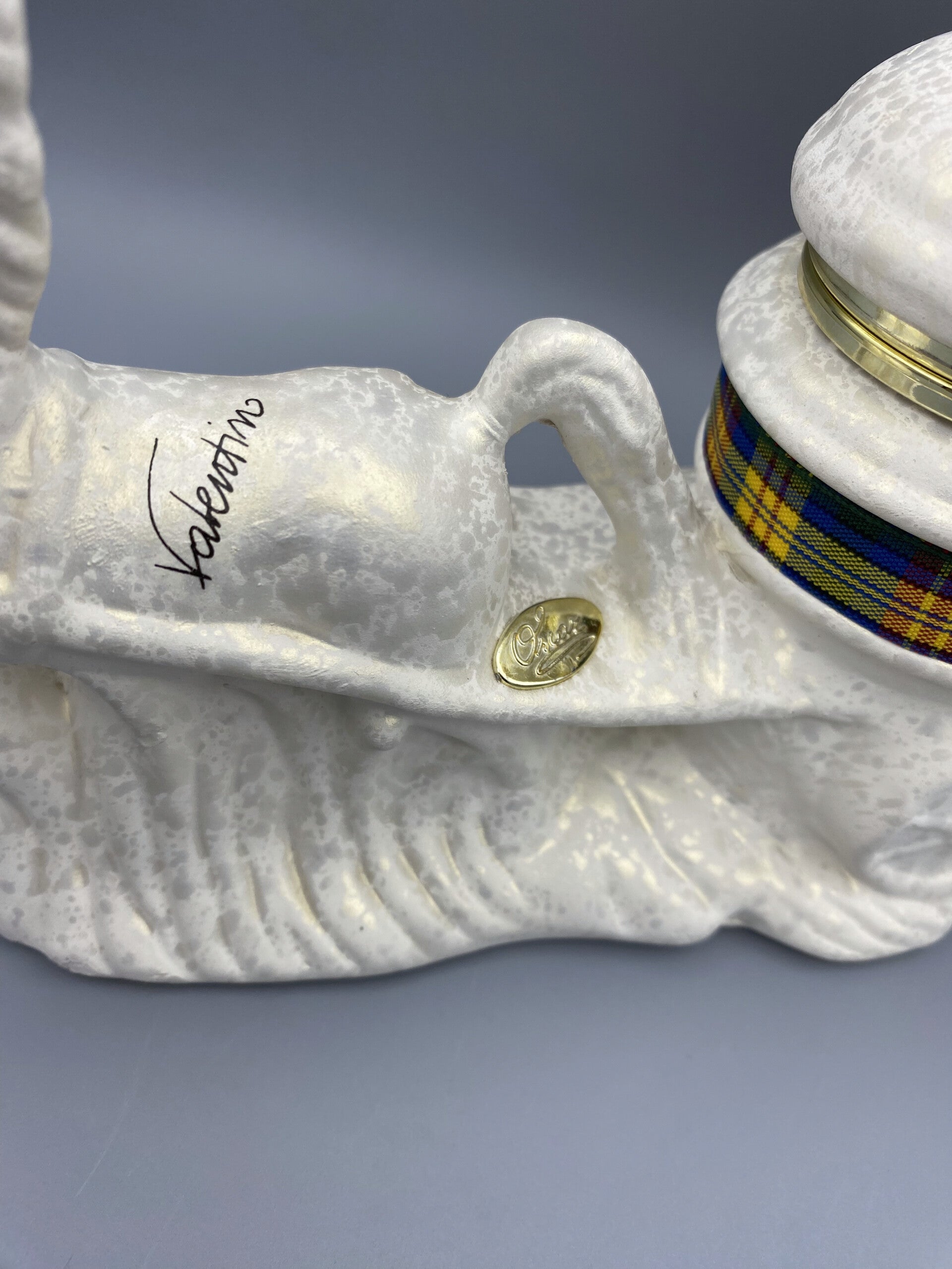 Gemerkt, van gips met een goudkleurige glans. Het heeft een potje wat geopend kan worden. Is in zeer goede staat