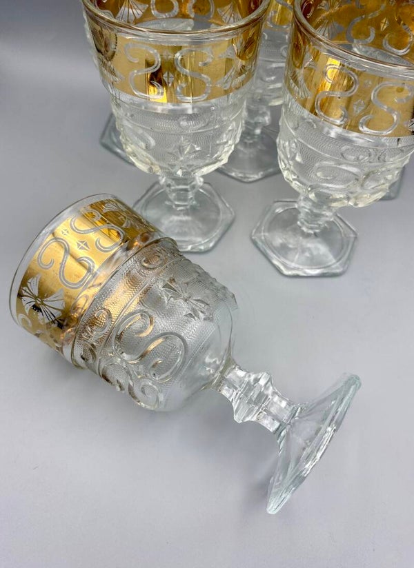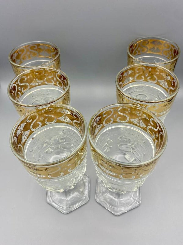 Italiaanse glazen! En wat zijn ze prachtig, echte sieraden om mee te proosten. Ze zijn in zeer goede staat, hier en daar zit er een klein krasje op het gouden patroon. Het is een set van 6 stuks.