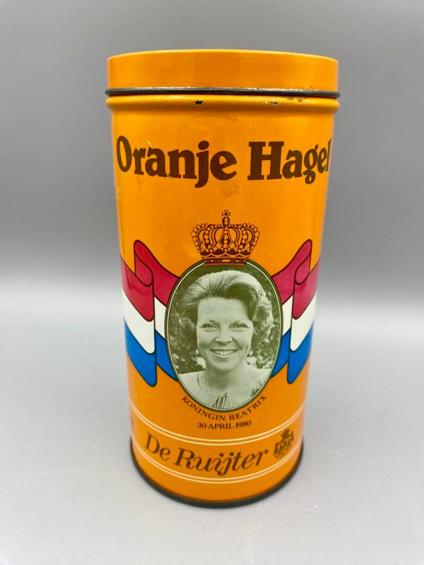 Onze eigen royals op dit vrolijke oranje blikje, 1980, troonopvolging. Het is in goede vintage staat.
