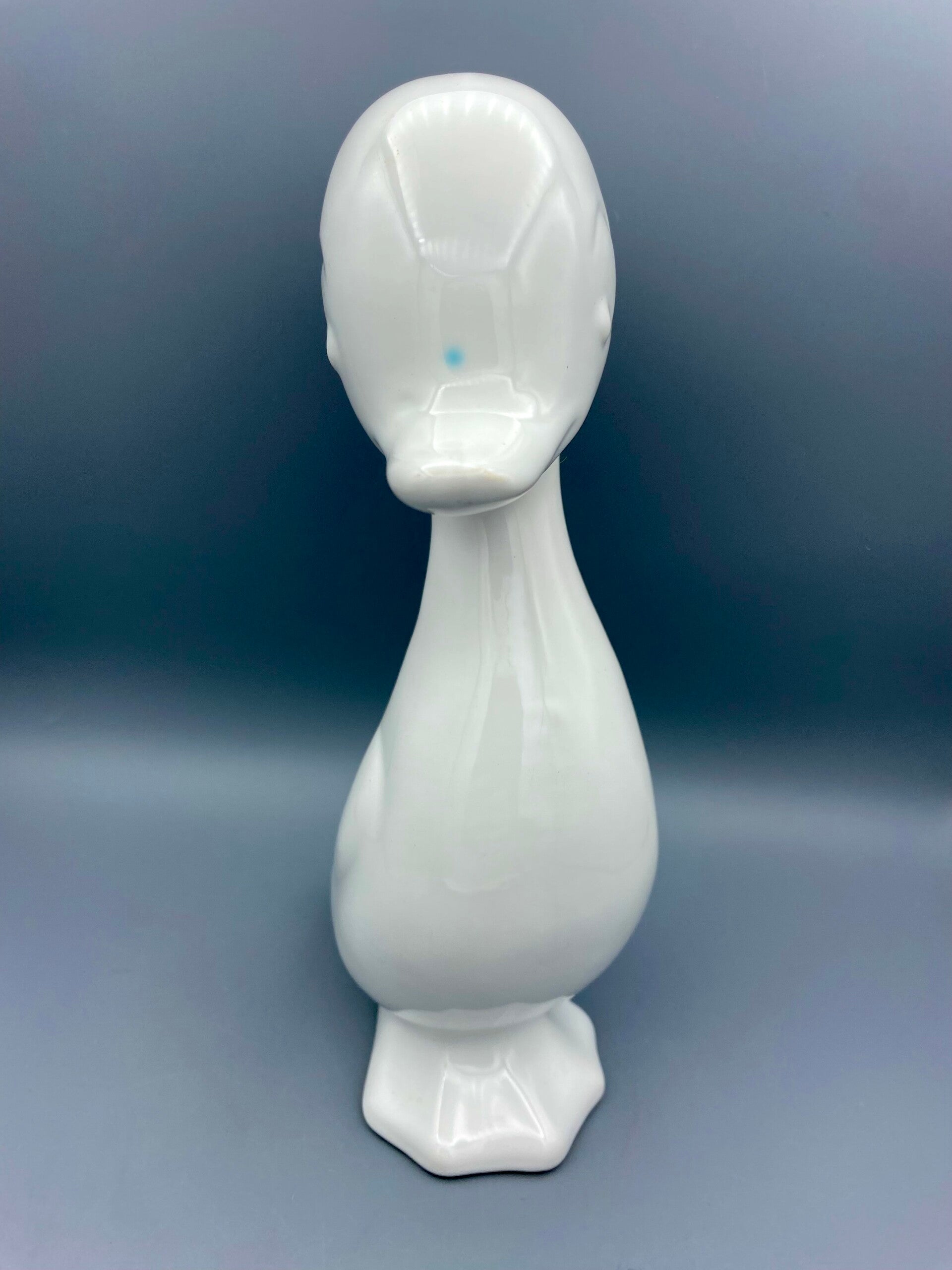 Waanzinnig leuke decoratie deze grote vintage eend in wit! Hij is in perfecte staat, het enige wat aan te merken is, is een blauwe sti boven zijn snavel.