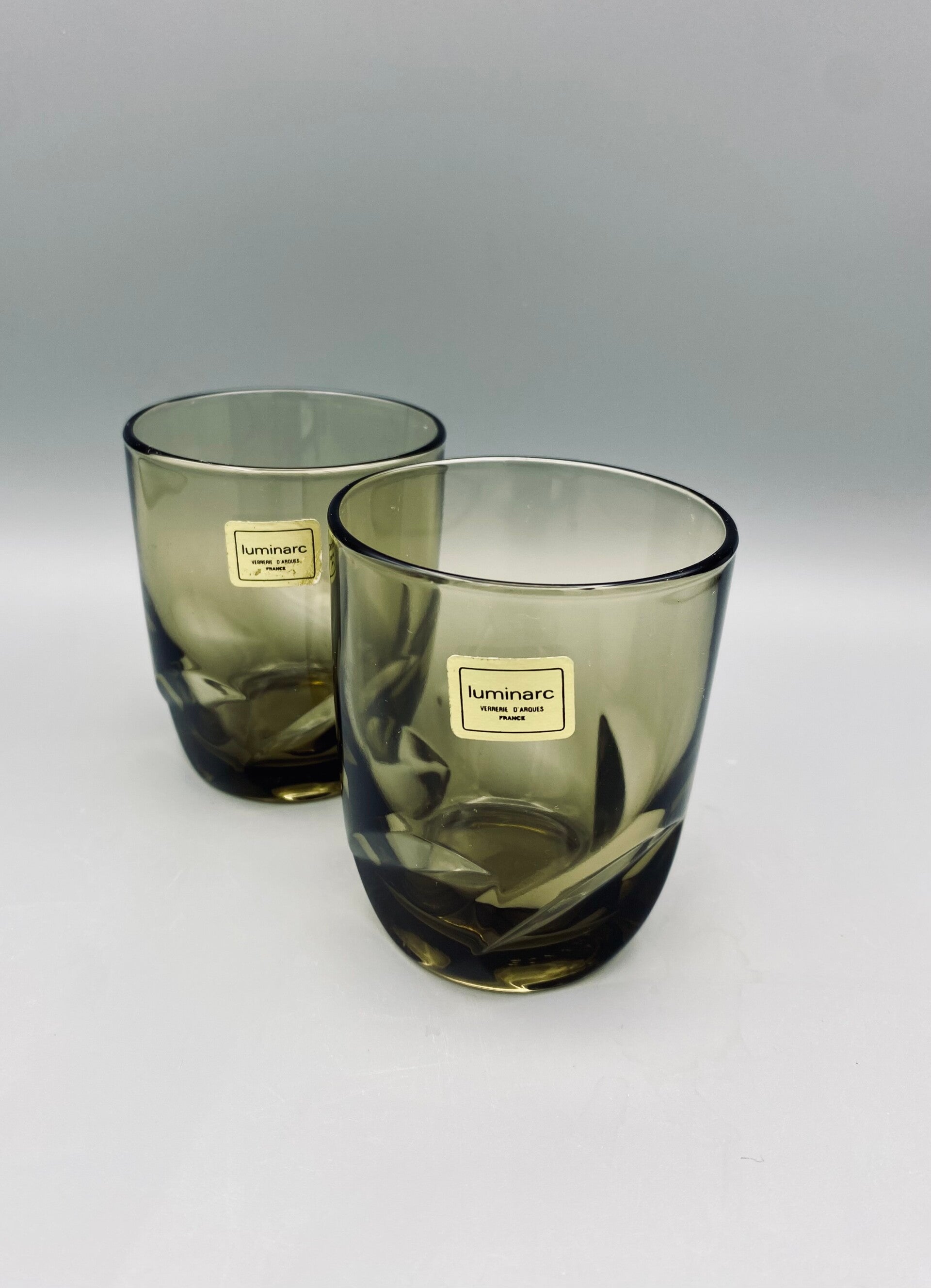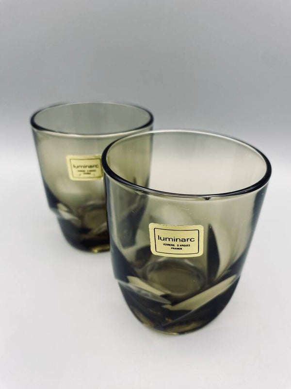 Uit de jaren 70, waanzinnig mooie glazen, rookglas. De stickers ziiitten er nog op. Set van 2.