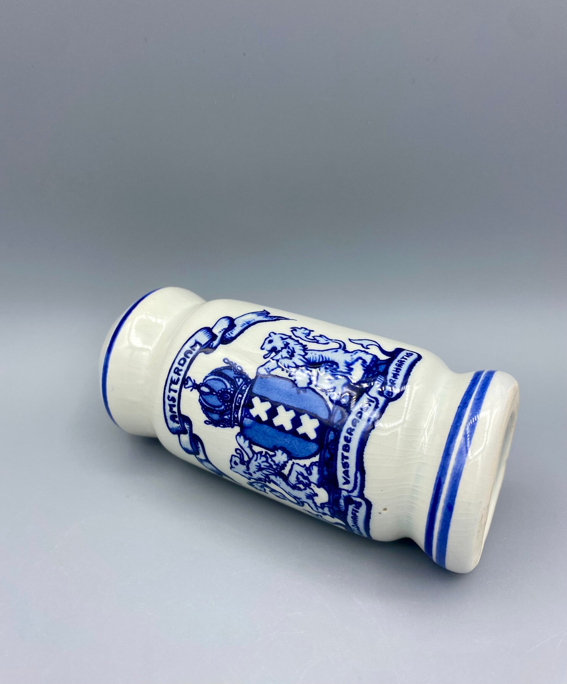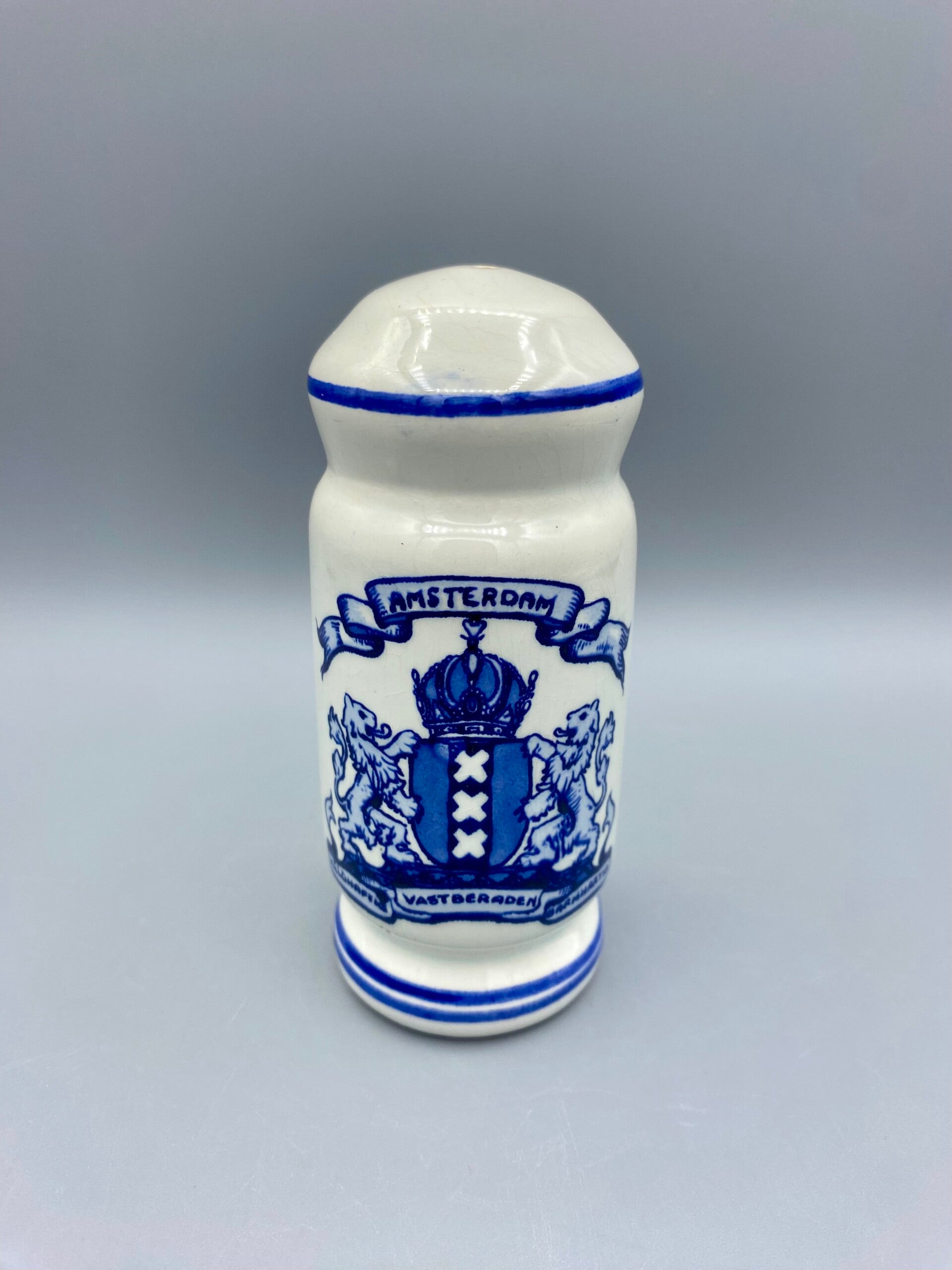 Handbeschilderd porseleinen Zoutvaatje met het wapen van Amsterdam. In perfecte staat, uniek item. Het heeft een kunststof dop aan de onderkant.