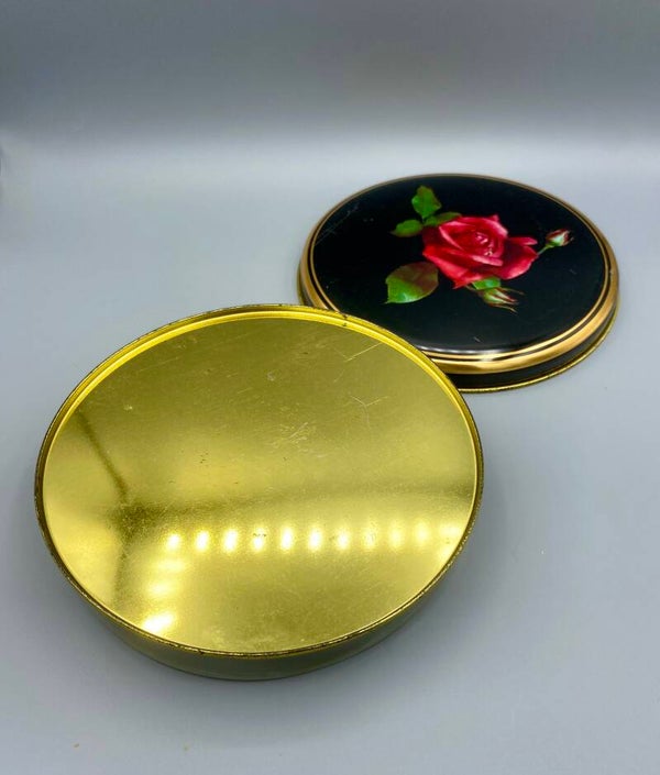 Mooi formaat vintage blik met print, het is gemerkt. Heeft gebruikssporen maar sluit goed.
