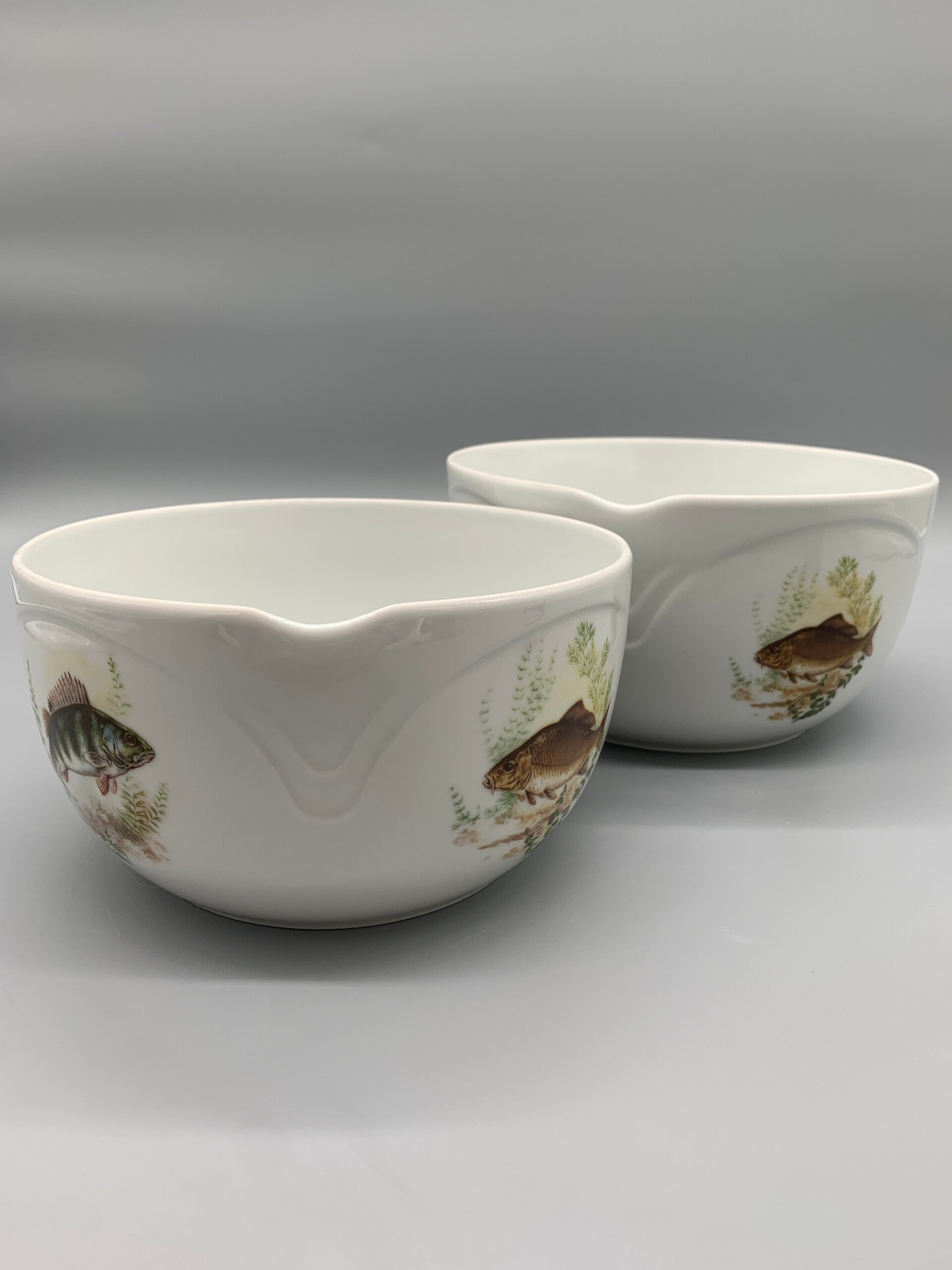 Prachtige set van hoge kwaliteit porselein, met decor van vissen. Het is een set van schalen in twee maten, gemerkt.