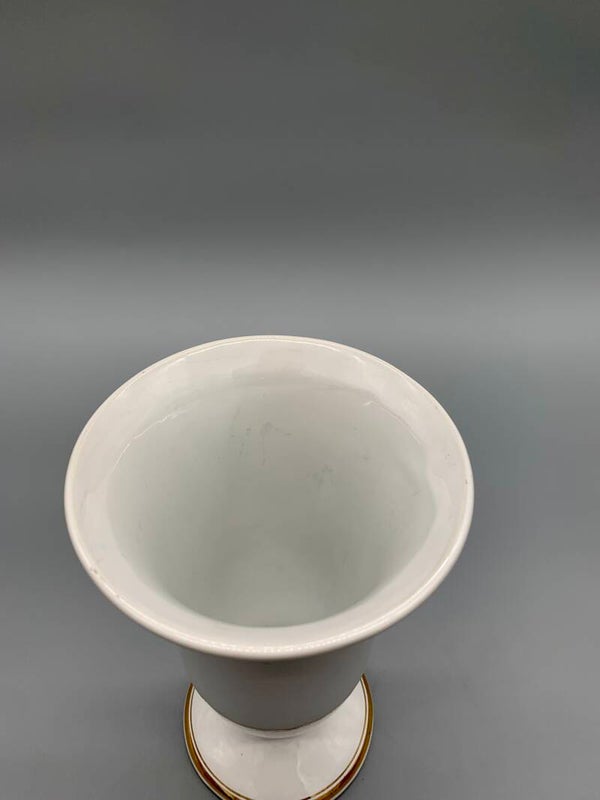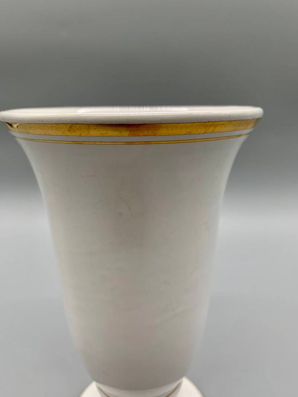Wat een mooi simpel vaasje met gouden details! Gemerkt op de bodem. Geen chips, geen breuk, wel wat lijnen van ouderdom.