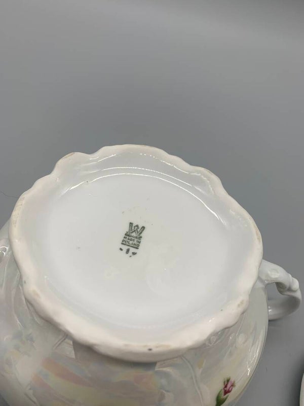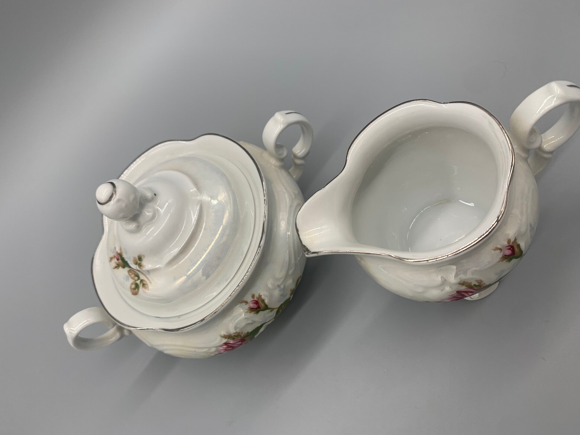Dit is toch wel heel erg mooi! Met een zilveren randje, rozenprint en een parelmoerglans! Het is in goede vintage staat, wel heeft de suikerpot onder de rand een chip, zie foto.
