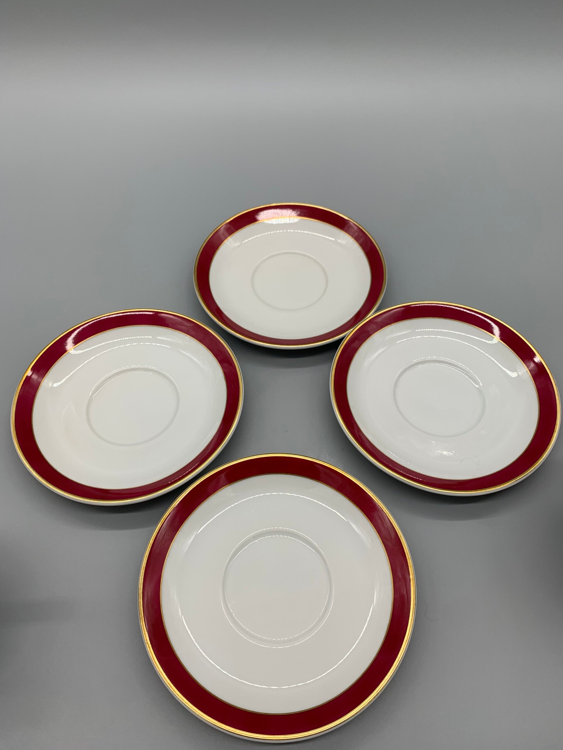 Een prachtige 8 delige set met een bijzonder merkje en genummerd. Mooie bordeaux rode kleur en brede gouden randen. In zeer goede staat.