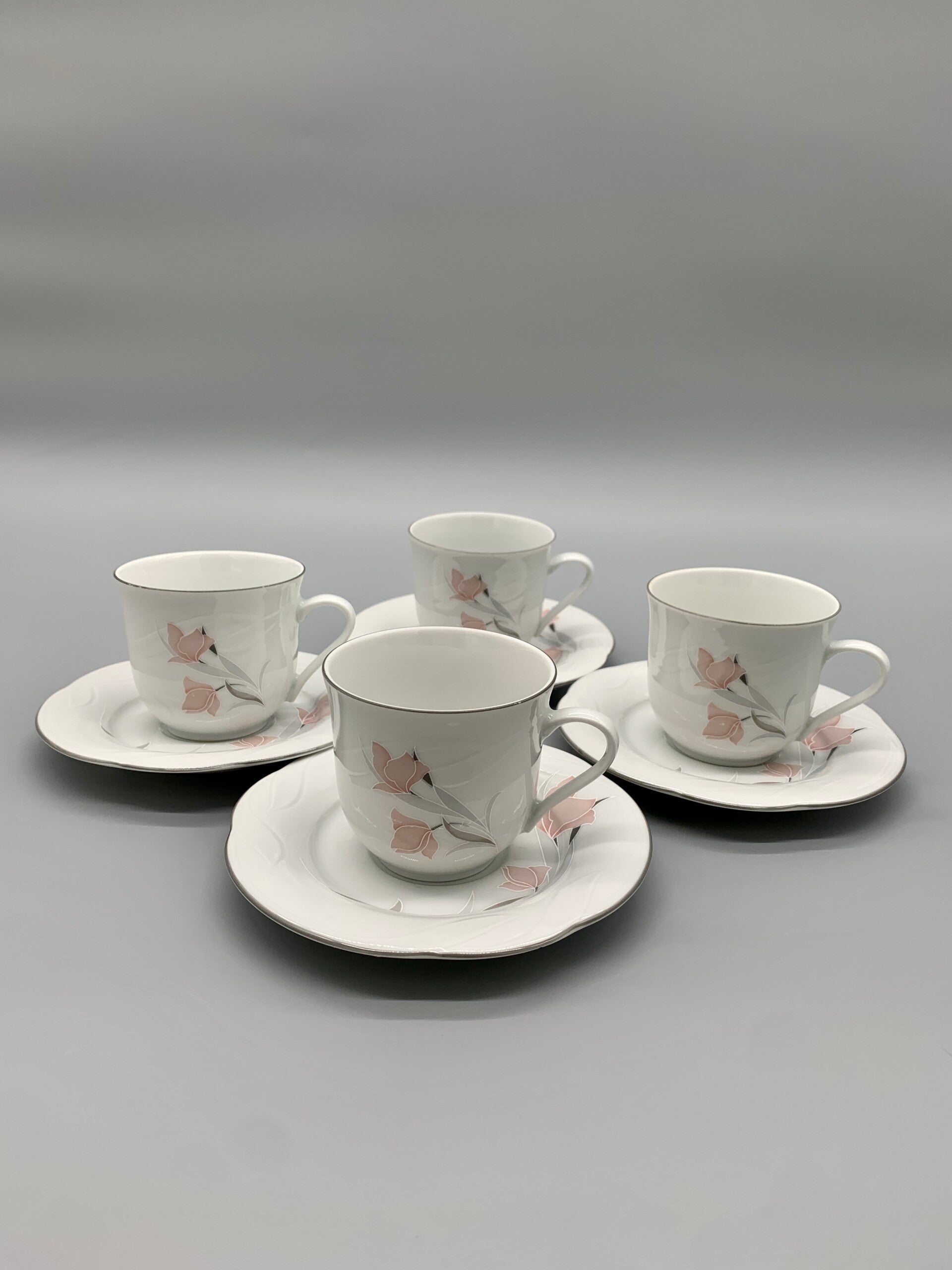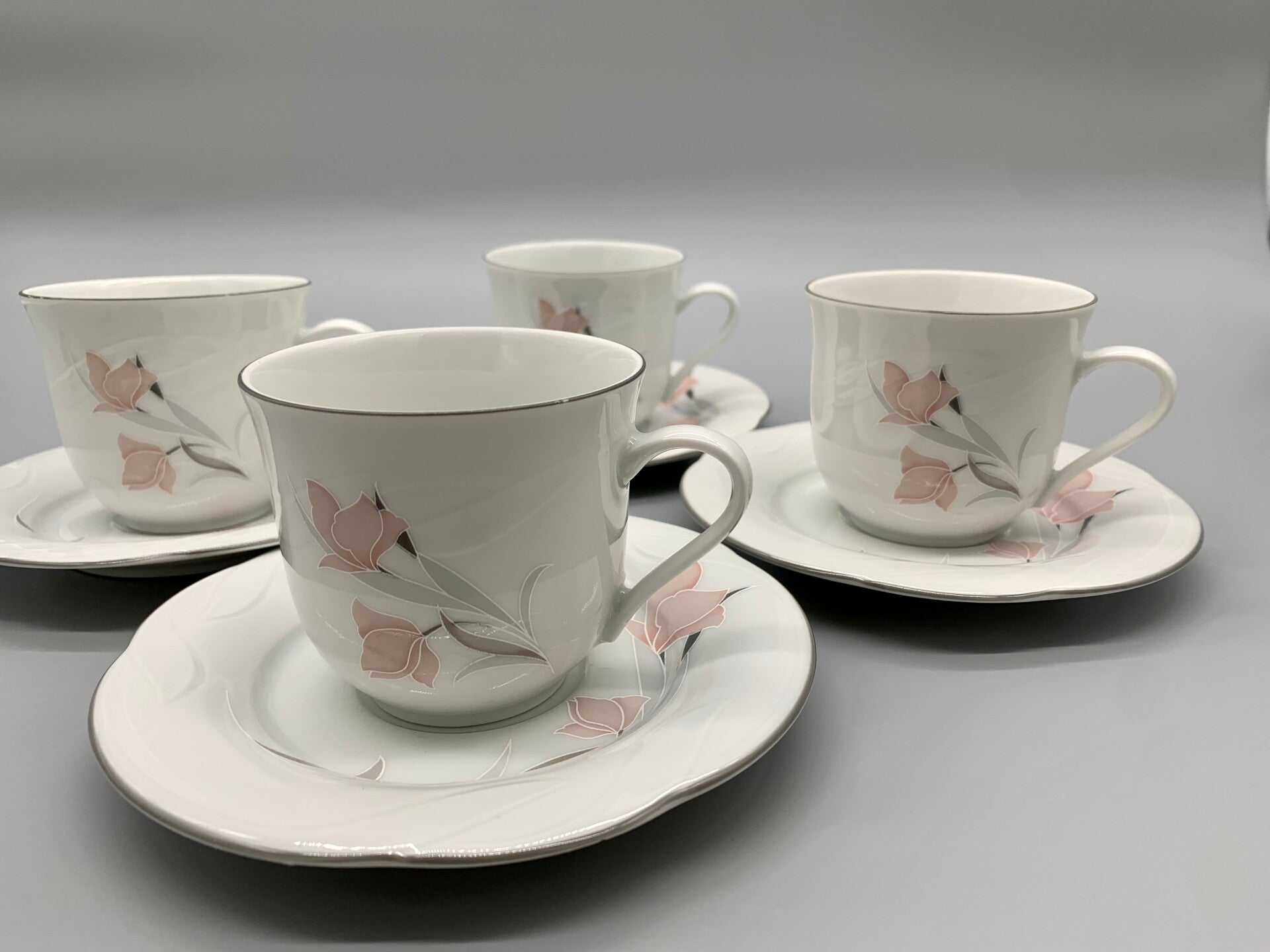 Prachtige set Duitse vintage kop en schotels, mooie trinten grijs, roze en zilver. Het zijn vier kop en schotels en allemaal in zeer goede staat, aan te merken is dat het zilveren randje hier en daar iets vervaagd is.
