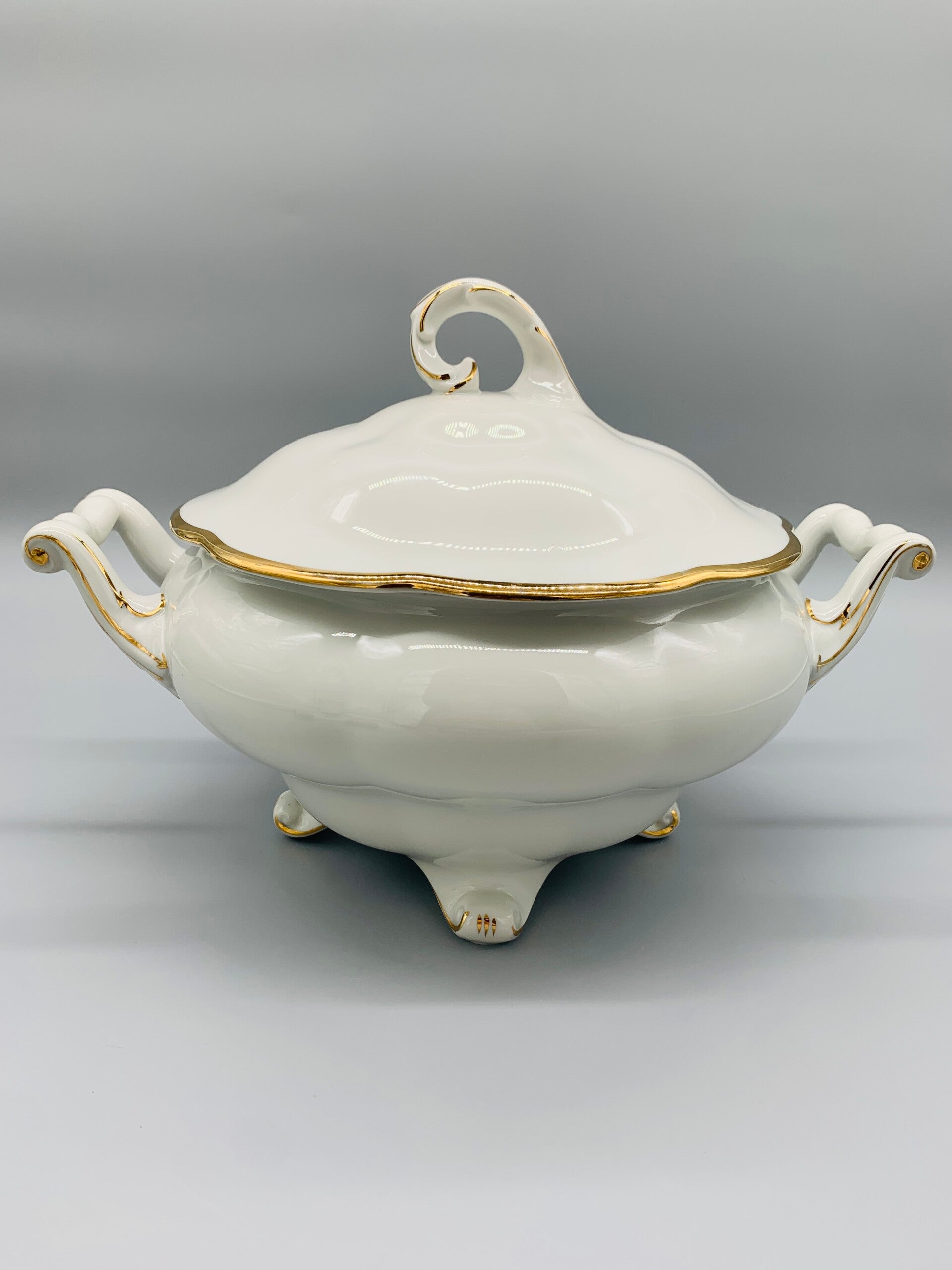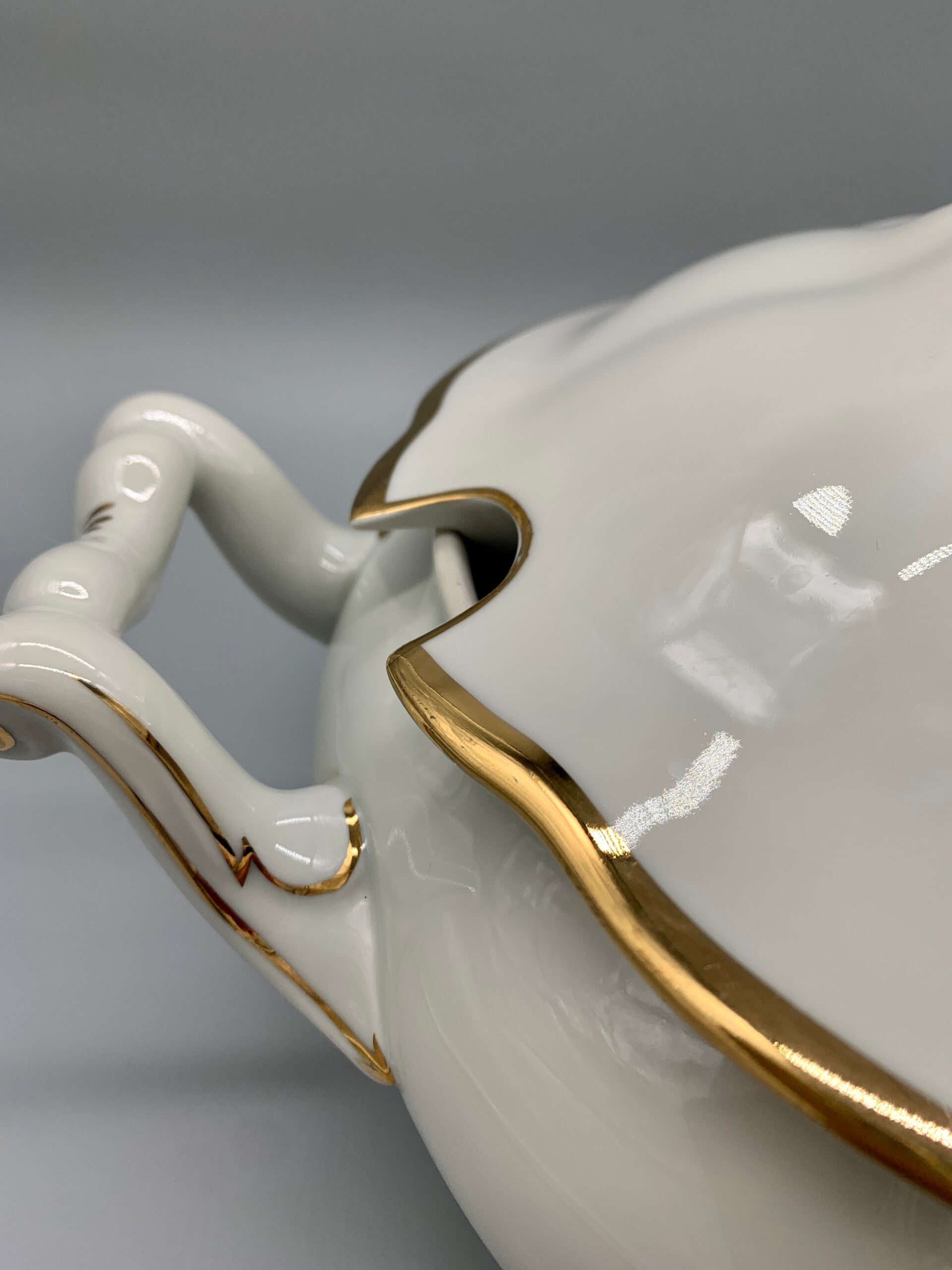 Een prachtige terrine, rijkelijk verguld randje en details. Roomwitte kleur, klassiek model. De terrine is in zeer goede staat, op het randje zit 1 foutje, zie foto.