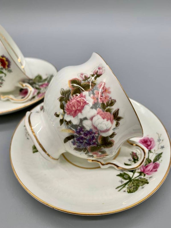 Een 4 delige set, de twee schotels hebben dezelfde rozenprint, de kopjes zijn verschillend. Een leuke mix and match vintage set in zeer goede staat, zelfs de vergulding is nog rijkelijk aanwezig