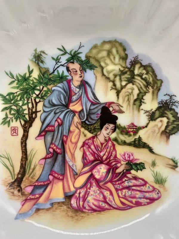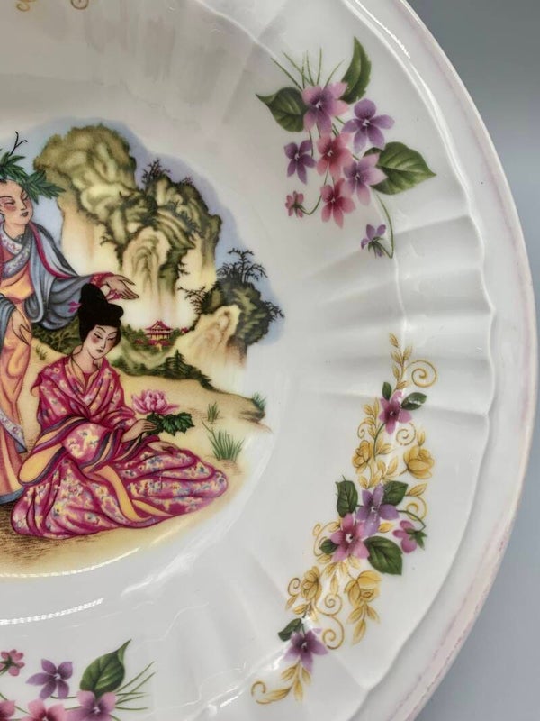Een prachtige schaal met kleurrijke print, het heeft een mooie zachtroze rand en bloemdecor. De print is in Japanse stijl maar gemaakt door Limoges. Het is in zeer goede staat, met een kleine nauwelijks opmerkbare imperfectie aan de bloemenrand.