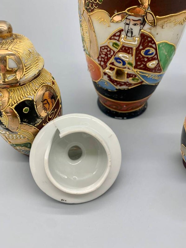 Een prachtige set, alle handbeschilderd en rijkelijk gedecoreerd. In zeer goede staat, aan te merken dat het dekseltje van het grootste vaasje een breuk heeft aan de binnenkant, zie foto.