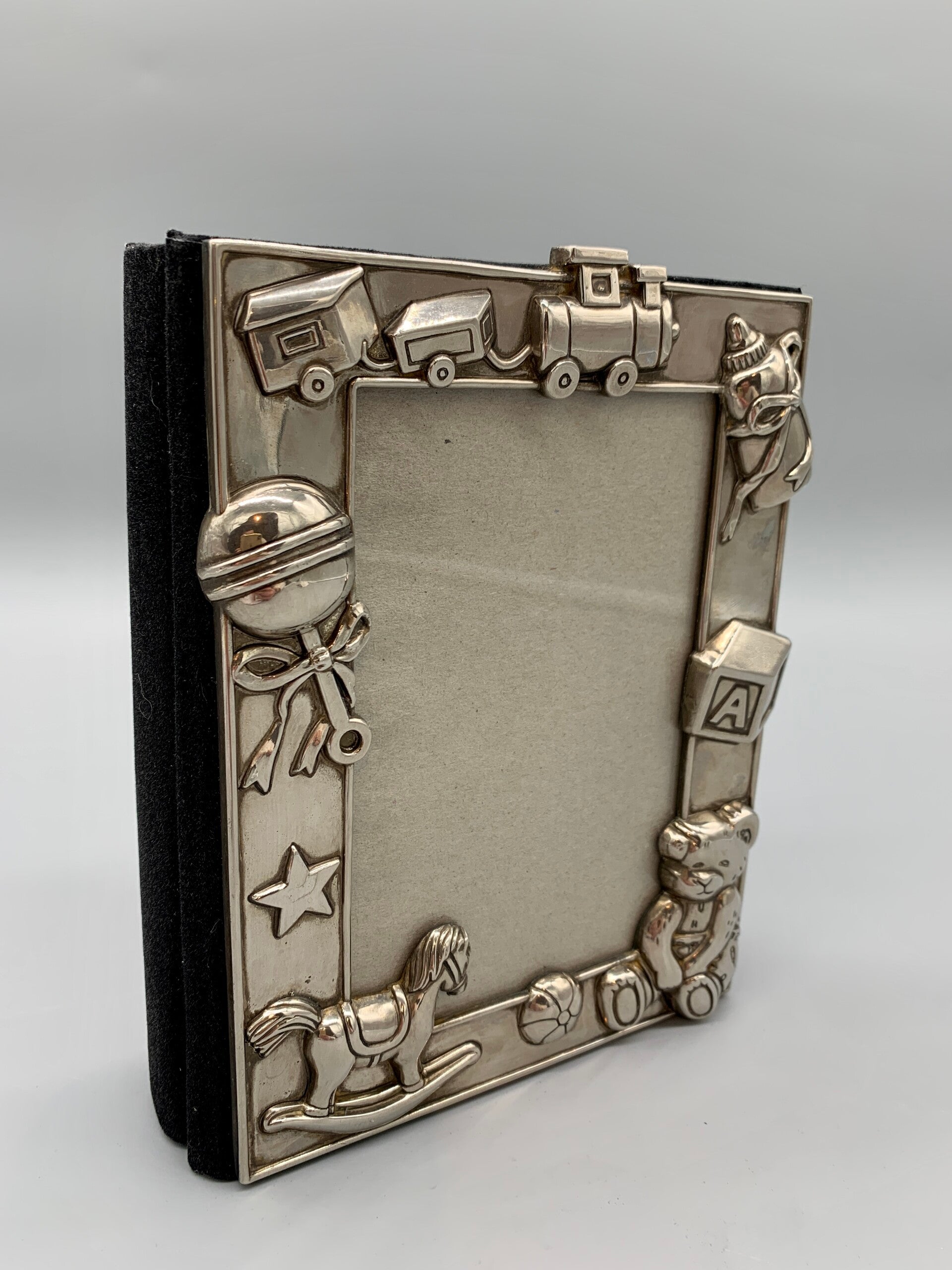 Voor echte foto's! Heeft een prachtige fotolijst op de voorkant, verzilverd metaal en glas, binnenkant is gevuld met insteekmapjes, de map zelf is van zwart velvet. In zeer goede staat, het zilver heeft wat aanslag.