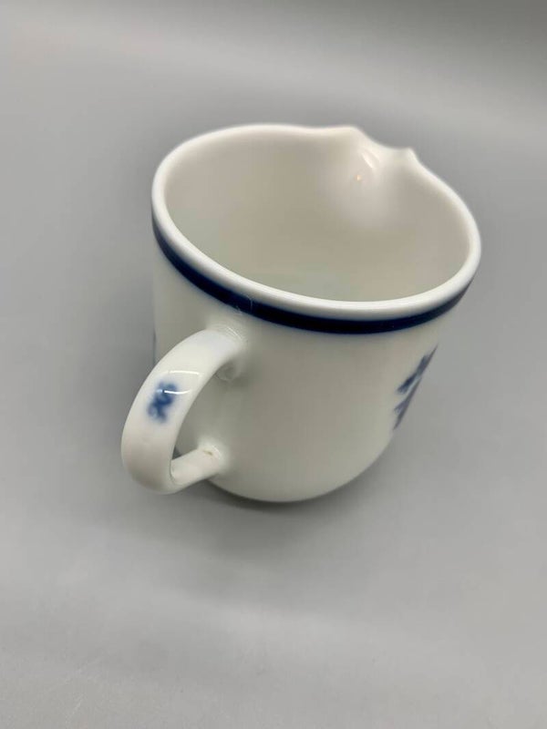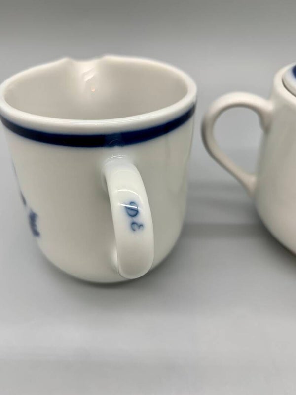 Prachtig vintage 'spray in glaze' roomstel in wit met blauw bloemmotief. Gemaakt door Mosa Maastricht, uitgegeven voor Douwe Egberts. Hebben de D.E. merkjes op het oortje en het Mosa merk en nummer op de bodem.