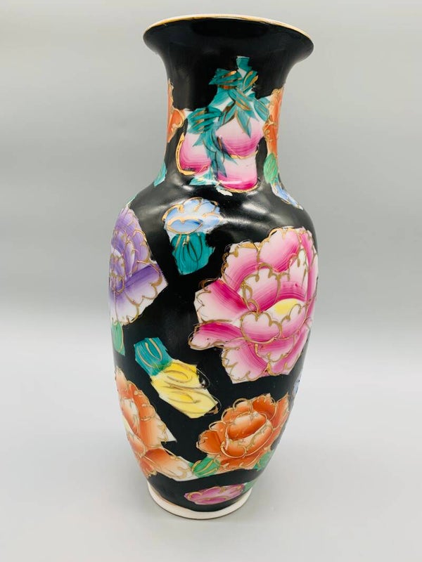 Een werkelijk prachtige vintage vaas. Mooie kwaliteit porselein, handbeschilderd en een verguld patroon. Ook zonder bloemen al een eyecatcher. Geen merkje kunnen ontdekken. In zeer goede staat.