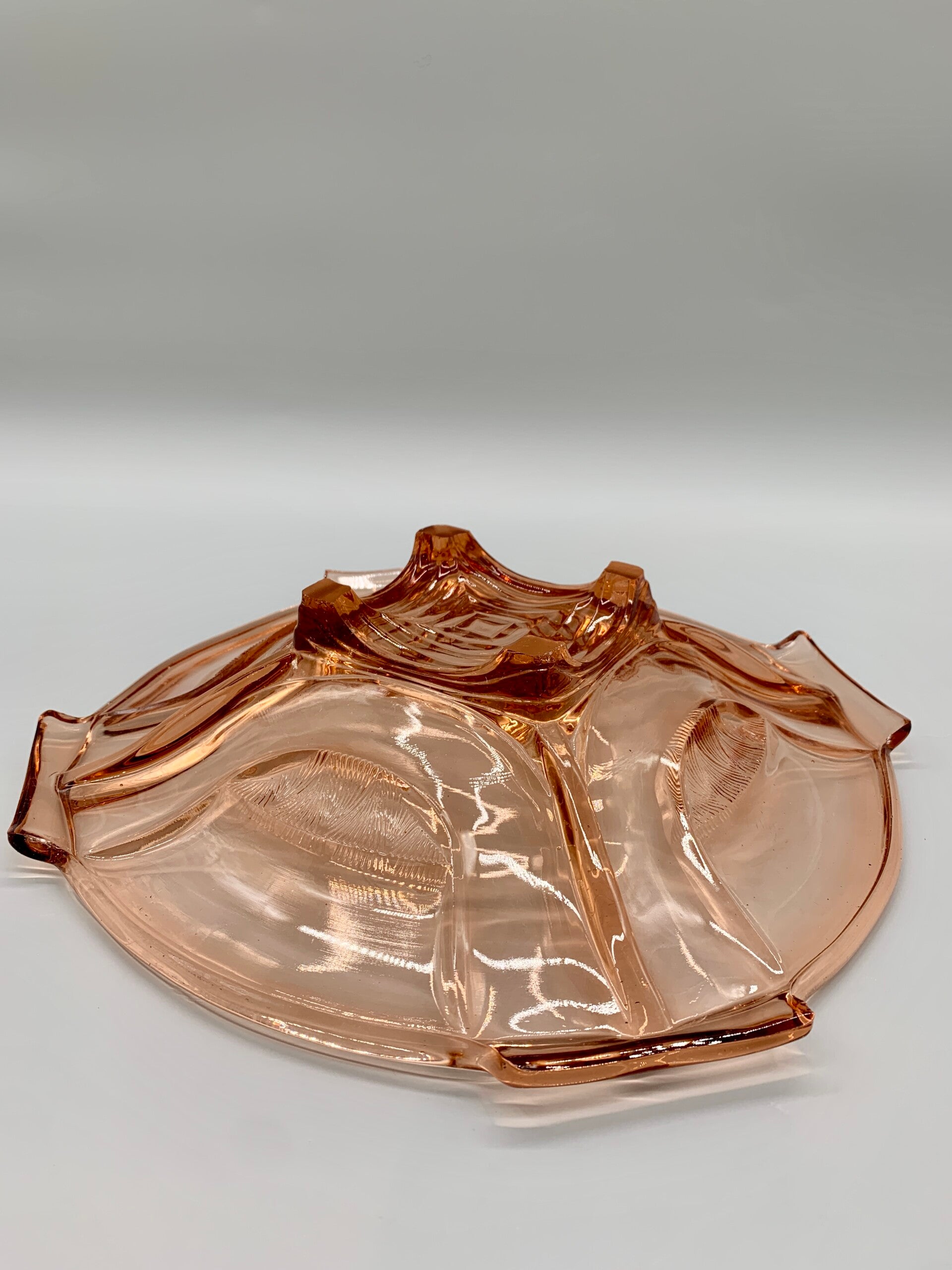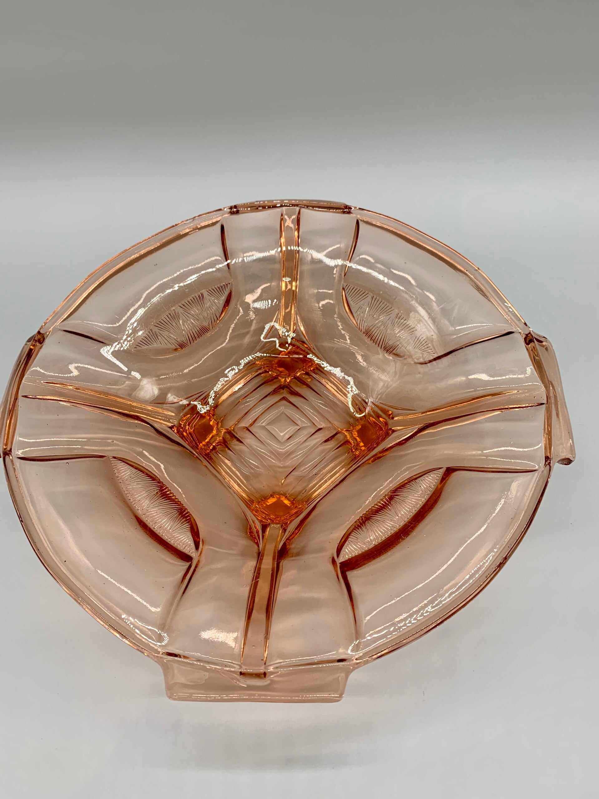 Wat een prachtige schaal in rosaline, zoveel details! De schaal heeft de naam Sigrid en is van het merk Walther & Sohne West Germany. Gemaakt in de jaren 30. In goede staat, aan te merken is een kleine onopvallende chip aan de onderzijde van 1 van de greepjes en een minimaal krasje.