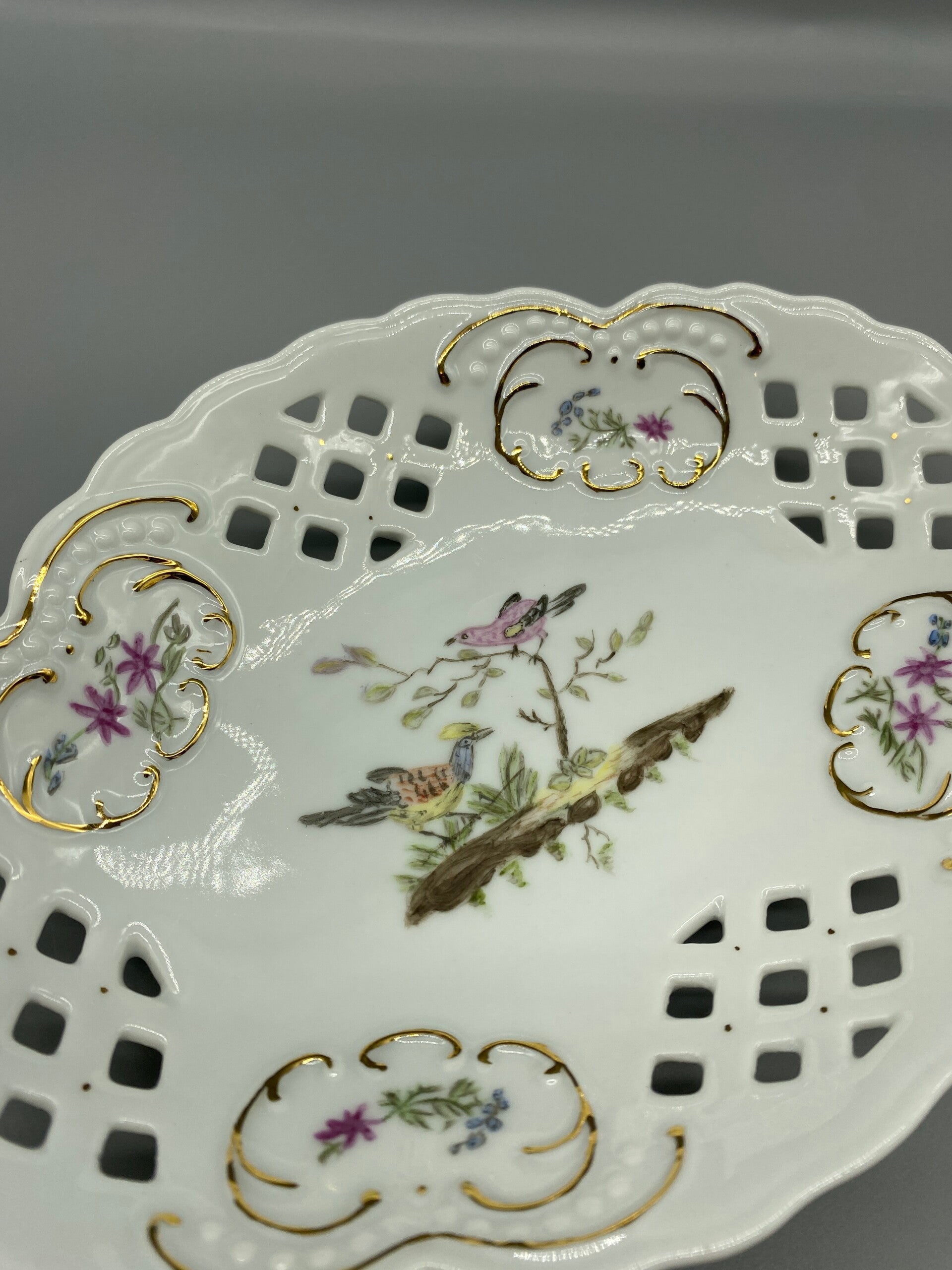 Wat een beauty, deze handbeschilderde porseleinen schaal met vergulde details. Gemerkt op de bodem TB7 Peint a la main. Schaal is in perfecte staat.