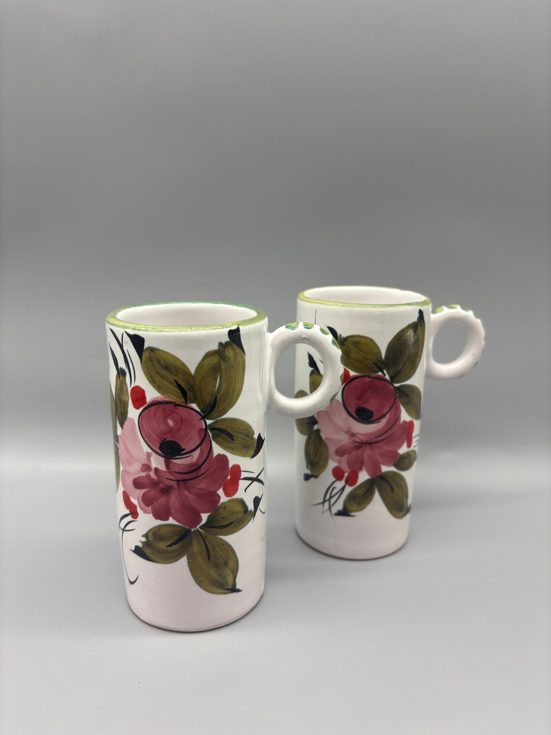 Prachtig setje van 2, handwerk. De mokjes zijn in zeer goede staat, aan te merken is een maak foutje aan de rand, zie foto.
