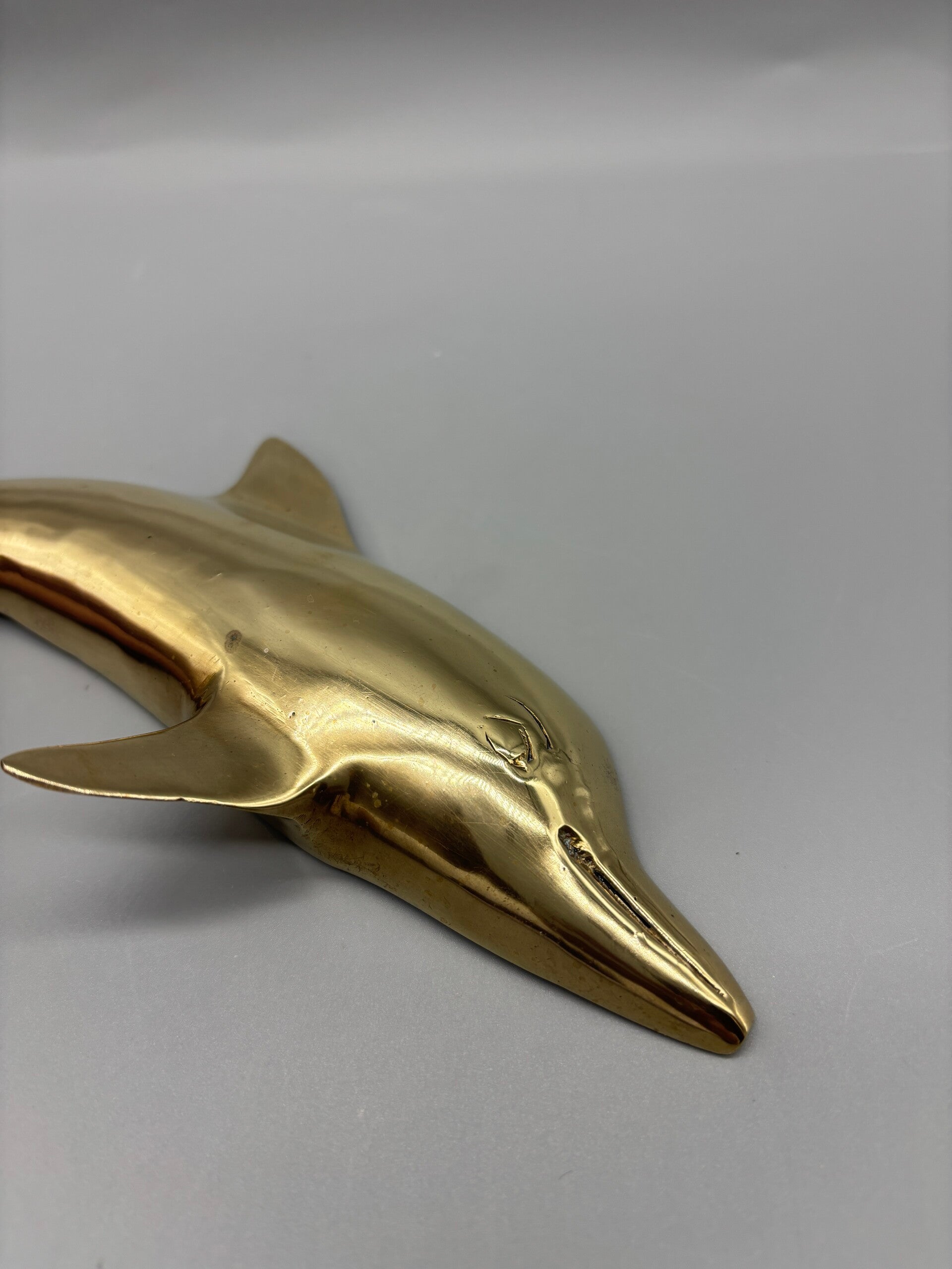 Deze prachtige dolfijn van messing heeft twee ringetjes om hem aan de muur te hangen, echt een pronkstuk. Is gepoetst en in zeer goede staat.
