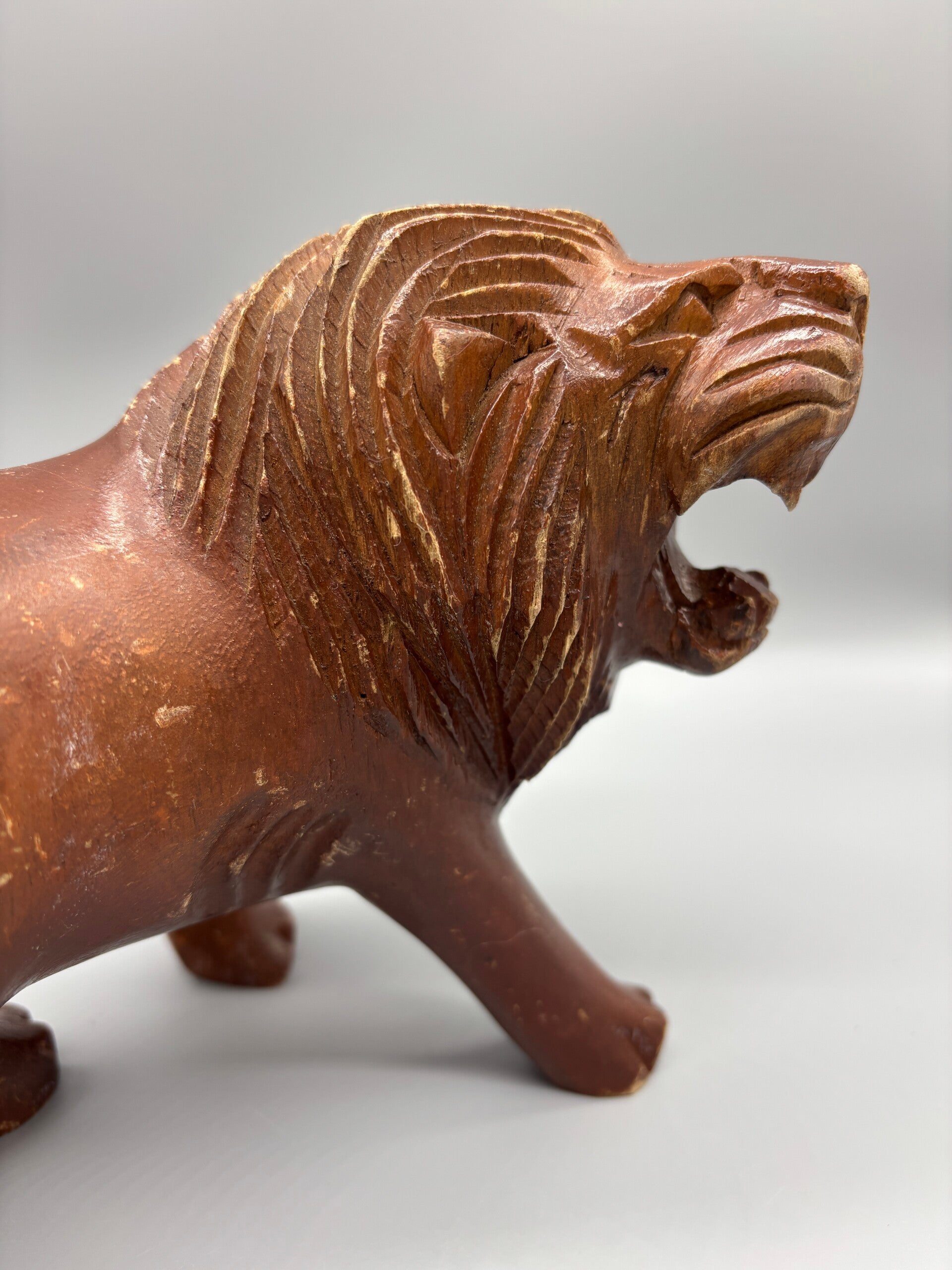 Nog zo een parel! Handgemaakt, antiek houtsnijwerk van een brullende leeuw. In goede staat, met wat charmante beschadigingen.